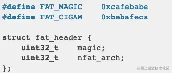 magic字段被定义为常量FAT_MAGIC,表示这是一个胖二进制,nfat_arch表示有多少个Mach-O文件。 每个胖二进制都用fat_arch结构表示,在fat_header之后,紧接着一个或多个连续的fat_arch结构体。