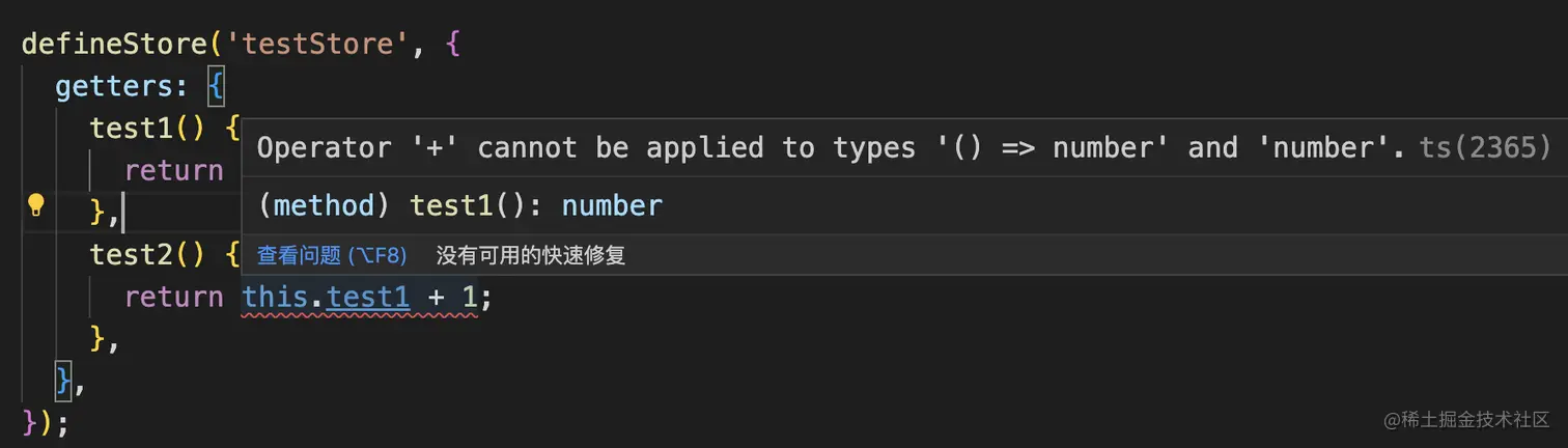 使用 pinia 中的 defineStore 时,类型推导不出来,this.test1 应该是 number 类型,但是推导出来的类型却是 () => number。