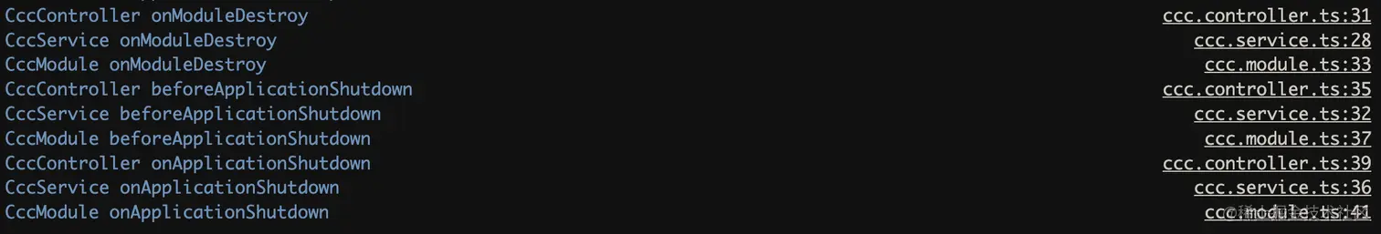 然后在对应的controller、service、module里分别添加下面几个生命周期函数: