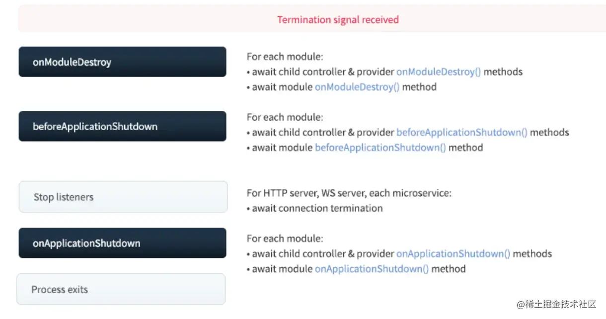 之后再调用每个模块的 controller、provider 的 beforeApplicationShutdown 方法,然后调用 Module 的 beforeApplicationShutdown 方法。然后停止监听网络端口。之后调用每个模块的 controller、provider 的 onApplicationShutdown 方法,然后调用 Module 的 onApplicationShutdown 方法。之后停止进程。