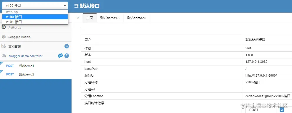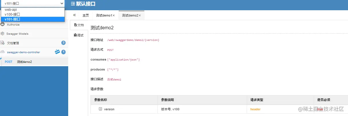 @RestController @RequestMapping("/web/swaggerdemo") public class SwaggerDemoController { @ApiOperation(value = "测试demo1", notes = "测试demo1") @ApiImplicitParam(name = "version", value = "版本号, v100", example = "v100", required = true, paramType = "header", dataType = "String") @ApiVersion(group = {"v100"}) @PostMapping("/demo1/{version}") public JsonResultAdapter<SwaggerDemoResponse> demo1(@PathVariable("version") String version) { if ("v100".equals(version)) { SwaggerDemoResponse swaggerDemoResponse = new SwaggerDemoResponse(); swaggerDemoResponse.setDemoValue(1); return JsonResultAdapter.success(swaggerDemoResponse); } return JsonResultAdapter.apiError(); } @ApiOperation(value = "测试demo2", notes = "测试demo2") @ApiImplicitParam(name = "version", value = "版本号, v100", example = "v100", required = true, paramType = "header", dataType = "String") @ApiVersion(group = {"v100", "v101"}) @PostMapping("/demo2/{version}") public JsonResultAdapter<SwaggerDemoResponse> demo2(@PathVariable("version") String version) { if ("v101".equals(version)) { SwaggerDemoResponse swaggerDemoResponse = new SwaggerDemoResponse(); swaggerDemoResponse.setDemoValue(1); return JsonResultAdapter.success(swaggerDemoResponse); } return JsonResultAdapter.apiError(); } }- @ApiVersion, 新增标签ApiVersion