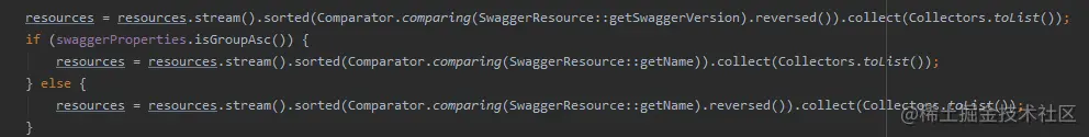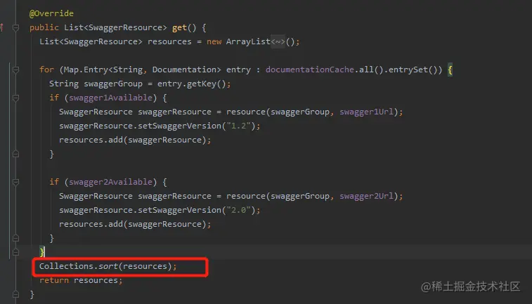 - 上述我们已经介绍了怎么去分版本来展示接口,但是swagger默认排序是升序,这样如果版本多,就会造成我们需要下拉到最后,下面我们介绍下swagger的分组名称排序,通过查看源码得知,排序是在springfox.documentation.swagger.web.InMemorySwaggerResourcesProvider.get()方法中进行排序