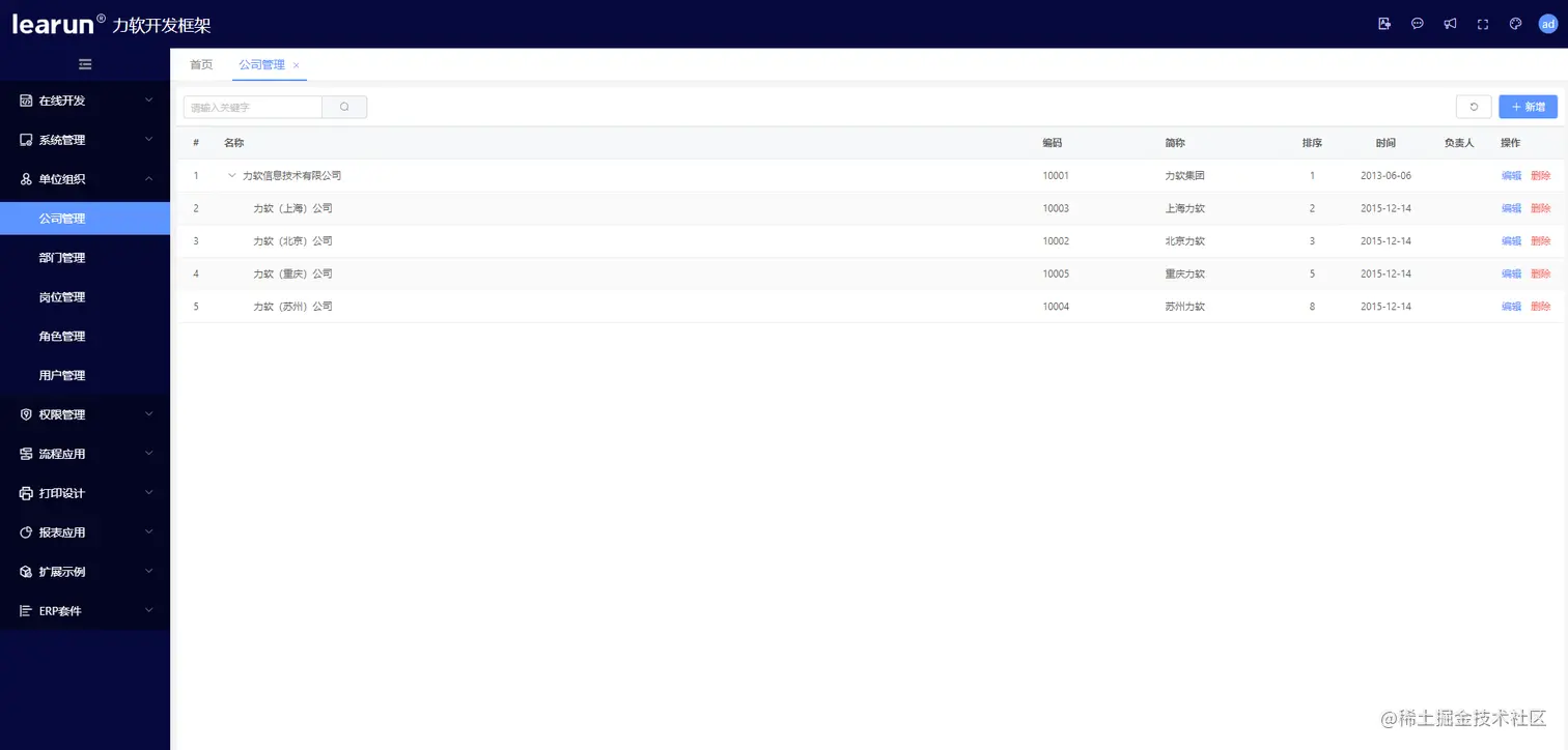 在LeaRun低代码开发平台里配置组织架构共有五个模块,首先建立公司体系,进入公司管理模块,点击[新增]可添加集团、分公司、总部、分部等多个组织,设置机构类型及相关负责人保存后即可完成创建,同时也支持企业根据内部架构个性化设置,让企业无需跨平台即可统一管理所有日常事务。