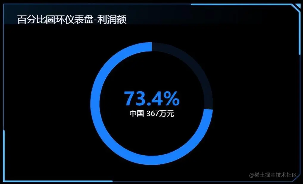 仪表盘用于展示百分比形式的重要指标,如目标的完成率、利润率等,仪表盘用圆环的色彩填充将百分比图形化,结合指标名称、指标值和百分比,紧凑且充分地展示该百分比指标的信息。