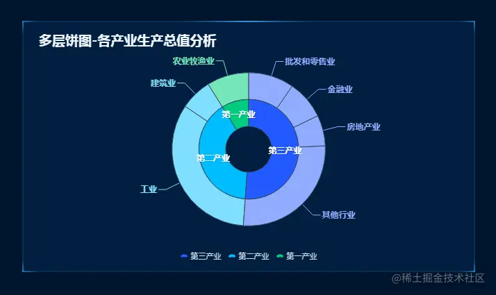 多层饼图的最内层是最大的维度分类,往外不断细分数据维度,相当于多个环形图的嵌套效果。