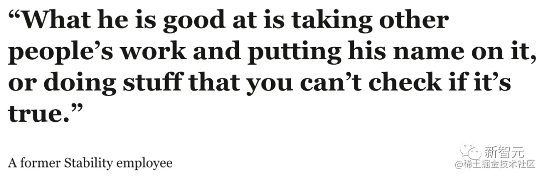 对此,一位Stability AI的前员工是这样评价Mostaque的:「他非常擅长拿来别人的作品,署上自己的名字,或者用来做一些无法验证真伪的事情。」
