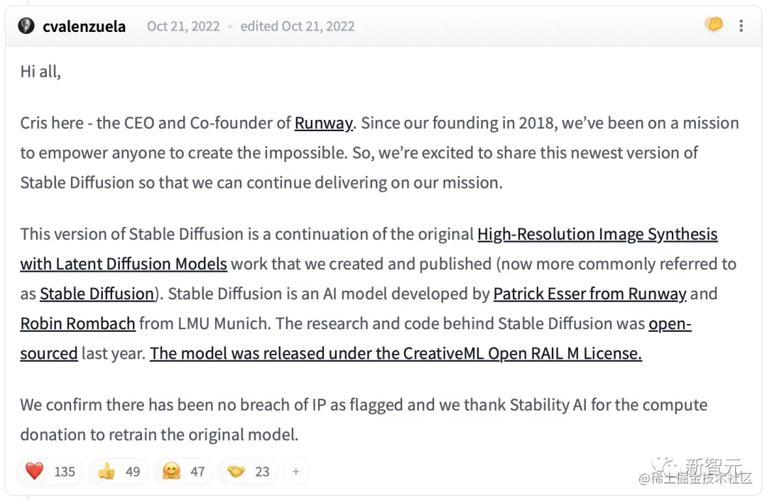 而Stability的发言人Bishara则表示,公司在官网和Stable Diffusion的GitHub页面上都曾多次公开提到了LMU和Runway的贡献。