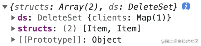 上一章节可以看到,不同 Doc 实例之间是通过 update 来进行数据的同步。update 主要是由 structs(所有 Item)和 ds(基于 state-base crdt 的 DeleteSet)组成。我们可以打印 update 来看下: