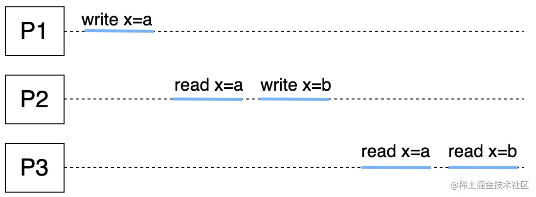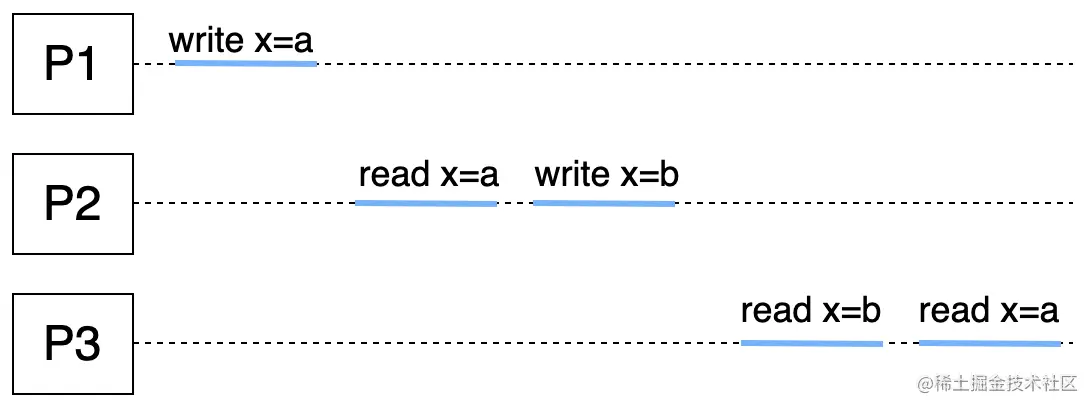 上图即为不满足因果一致性的示例。在P2节点内,先是读到x为a,再x赋值b;在P3节点,先是读到x为b,再读到x为a。可以发现P2和P3节点对于x的因果顺序是矛盾的。下图,为符合因果一致性的图例。