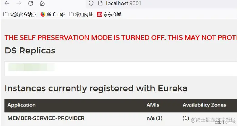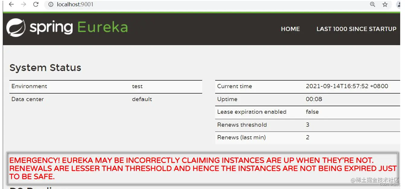 在默认情况下, Eureka 启动了自我保护模式(如图红字, 需要刷新页面, 可以看到)