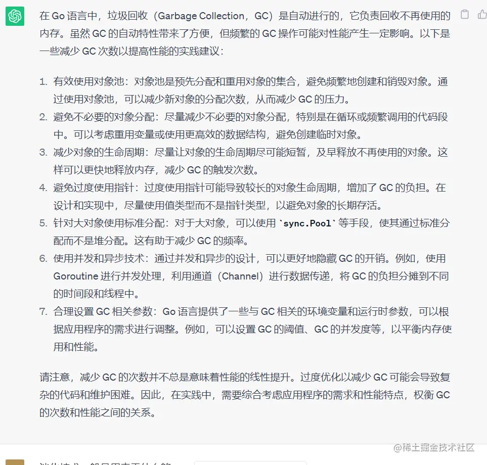 - 避免过度的内存分配。过度的内存分配会导致垃圾回收的频率增加,从而影响程序的性能。可以使用数组代替切片,避免使用字符串拼接等方式来避免过度的内存分配。