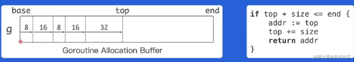 - 把每个g(goroutine)都绑定一大块内存(1KB),称作goroutine allocation buffer(GAB)