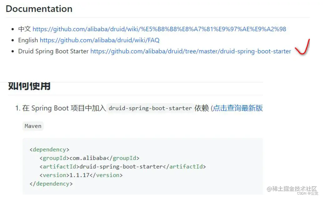 查看druid 文档https://github.com/alibaba/druid,引入druid starter
