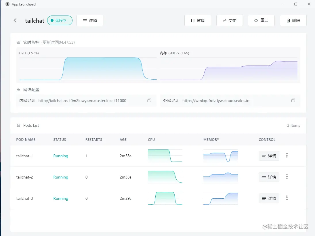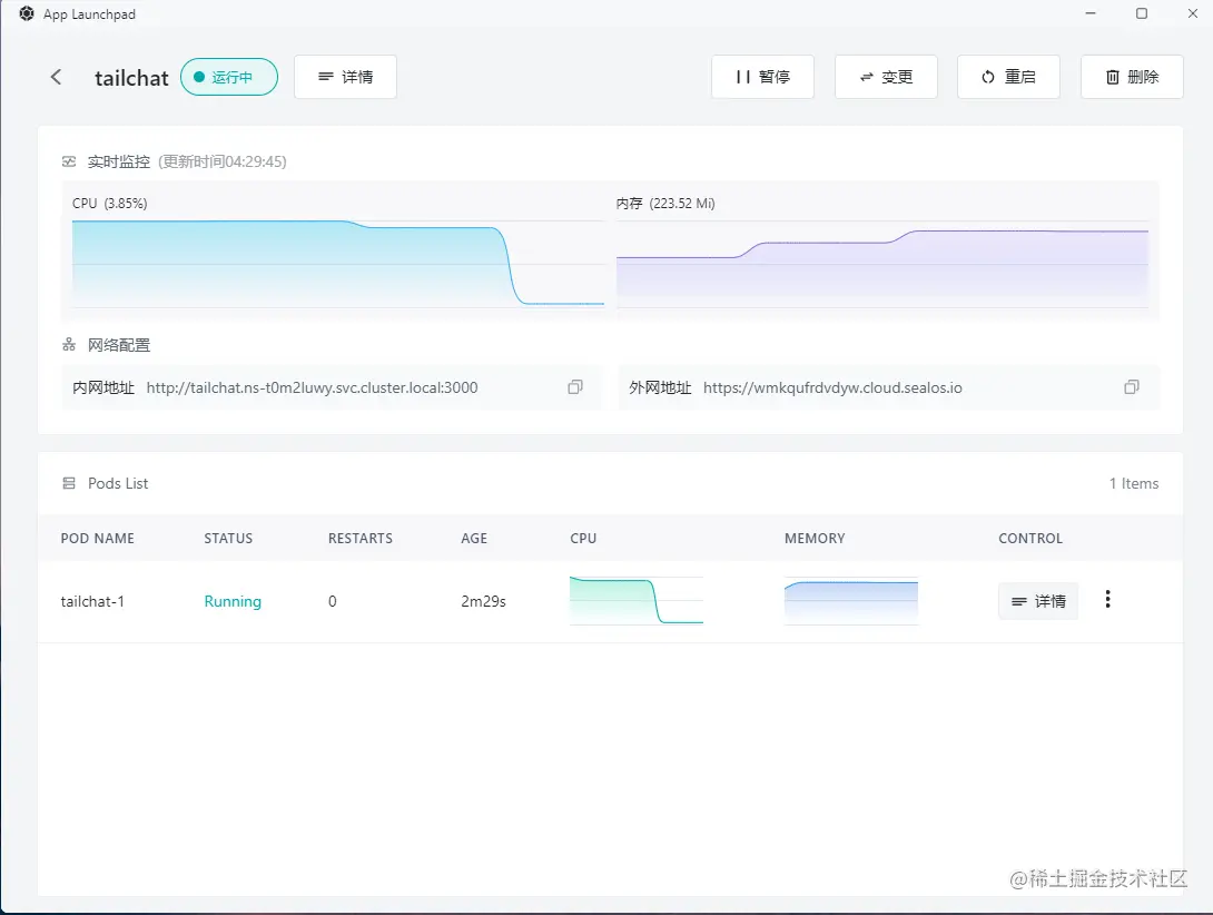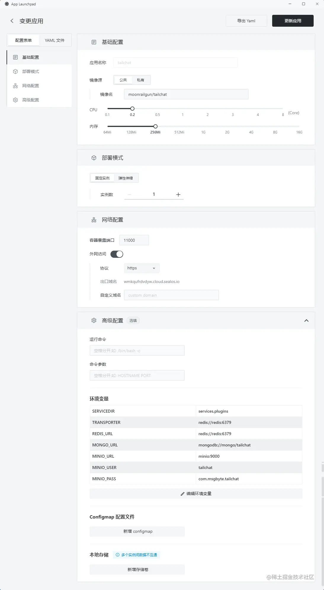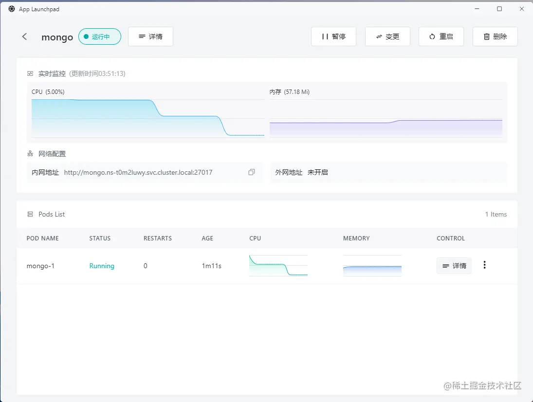 需要注意的是初始分配的64m对于mongodb来说实在太小了,所以通过变更应用改为了128m。可以随时分配资源大小这也是sealos/k8s很方便的一点