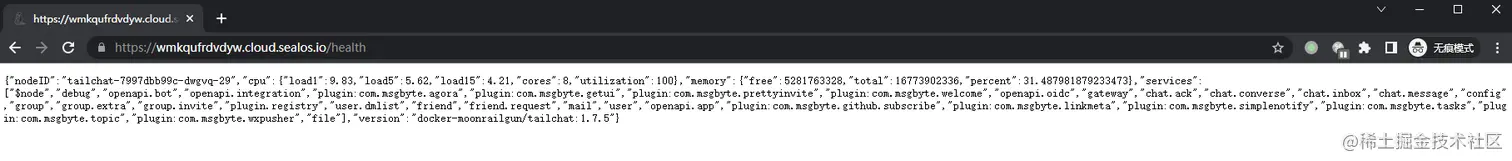 首先我们可以先检查一下Tailchat服务的可用性,可以通过外网地址提供的服务后面加上 /health 来检查服务可用性, 如: https://<xxxxxxxxxx>.cloud.sealos.io/health