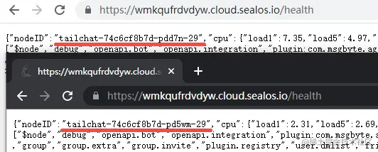 此时当我们访问 https://<xxxxxxxxxx>.cloud.sealos.io/health 可以看到我们可以访问到不同的节点
