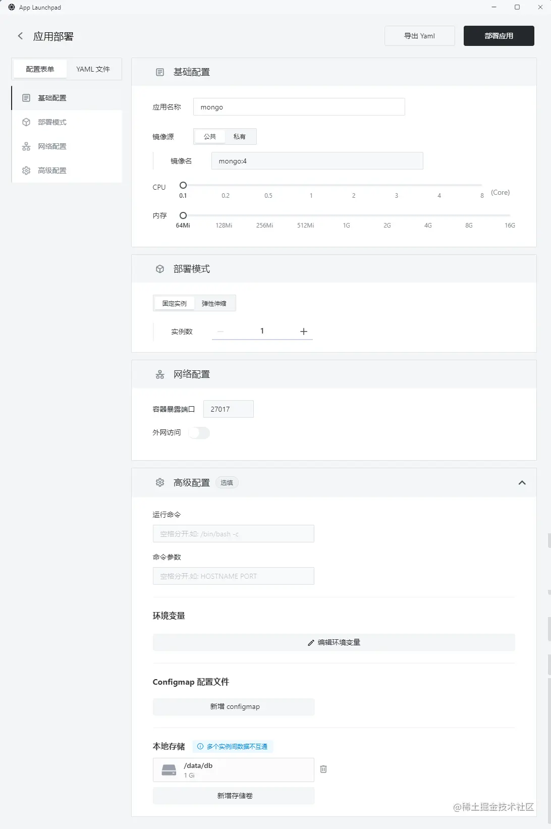 需要注意的是因为我没有给数据库设置密码,因此不要对外网提供网络服务。容器暴露端口填数据库默认服务端口 27017 即可