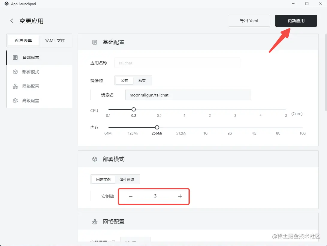 当然,作为一个分布式架构的系统,Tailchat 天然是支持水平扩容的。而在 sealos 想要实现扩容也非常简单, 只需要通过变更操作修改实例数即可: