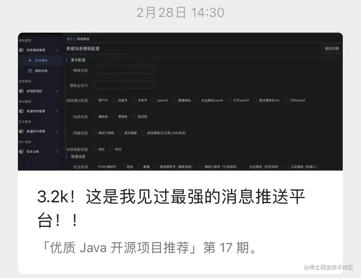 如果想学Java项目的,强烈推荐我的项目消息推送平台Austin(8K stars),可以用作毕业设计,可以用作校招,可以看看生产环境是怎么推送消息的。消息推送平台🔥推送下发【邮件】【短信】【微信服务号】【微信小程序】【企业微信】【钉钉】等消息类型。