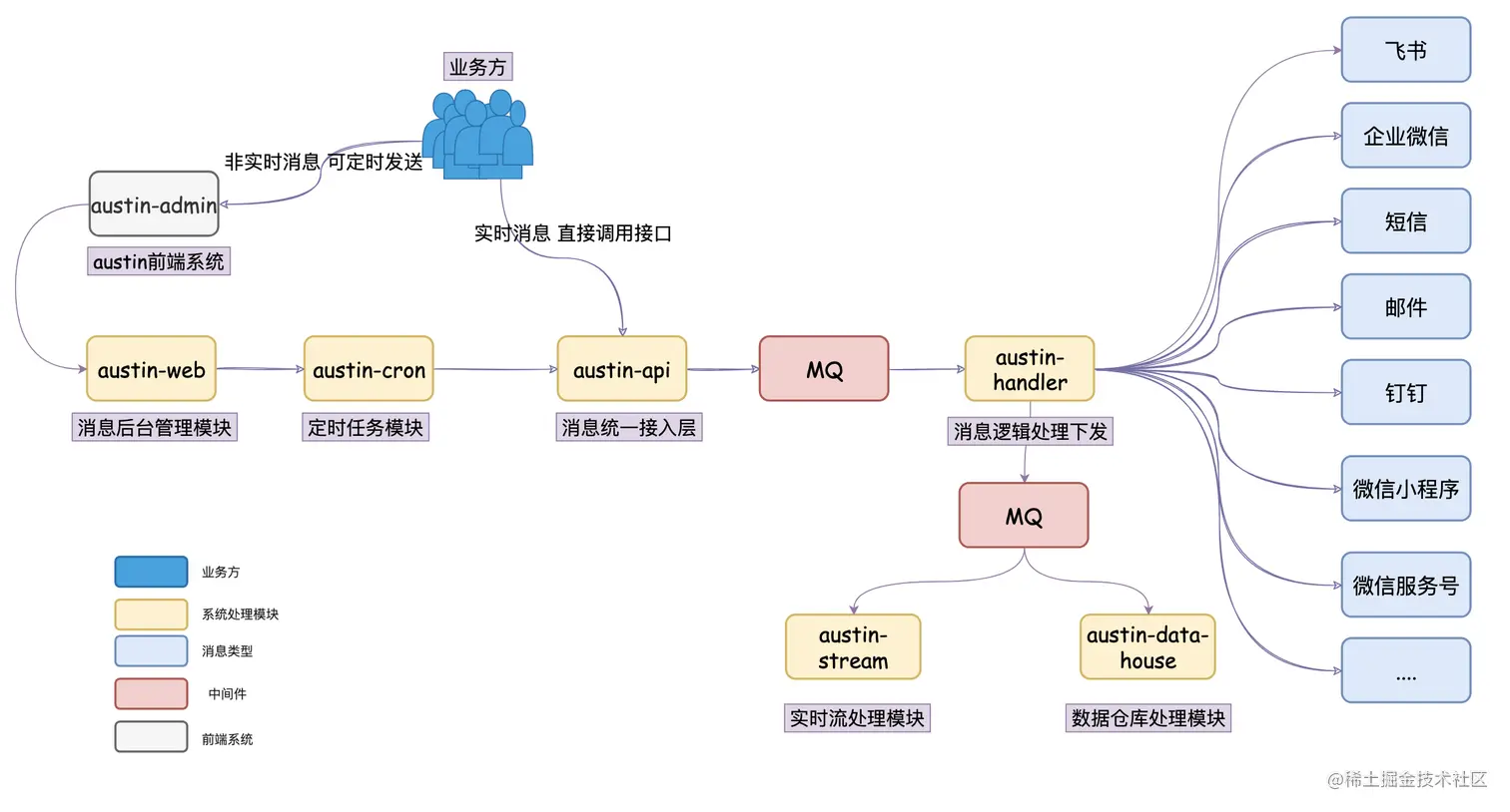 这个对于Austin来说就很简单啦,就发送消息。核心就是由接入层->MQ->消费逻辑层给组成,另外提供一个后台管理以及一个流处理模块
