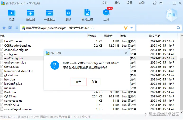 在资源客户端目录下找到 新斗罗大陆.apk,建议使用 360 压缩软件打开,找到 \assets\scripts\envConfig.lua 文件,将文件中所有 101.43.194.154 修改为你的服务器 IP 或域名,与上一步第二个站点对应即可。修改完保存,提示将修改更新到压缩包,选择确定即可。