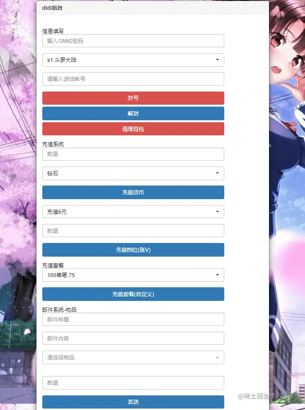 可以充值和发送物品,也可以进行授权,授权后玩家可以通过链接:http://IP:81/ht/ 使用后台 GM,后台功能很齐全,还有很多免费的功能哦~