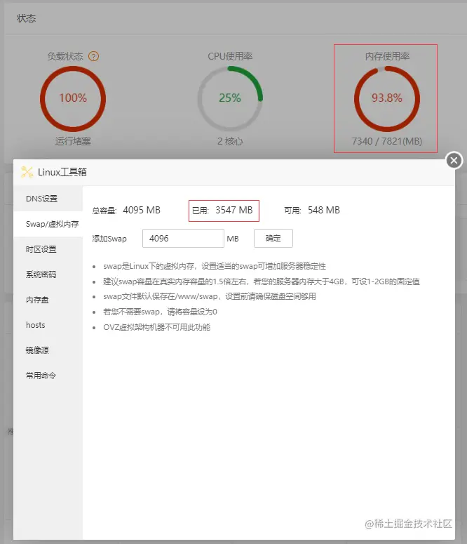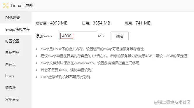 打开Linux工具箱,设置 swap/虚拟内存 4096MB,swap 是 Linux 下的虚拟内存,设置适当的 swap 可增加服务器稳定性。如果你使用的是 4G 内存的服务器,那么 swap 一定要设置才能成功启动游戏。