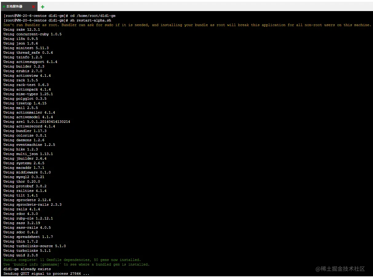 第一次启动会安装一些 gem 依赖,所以会很慢,请耐心等待,成功后看到安装的依赖列表。