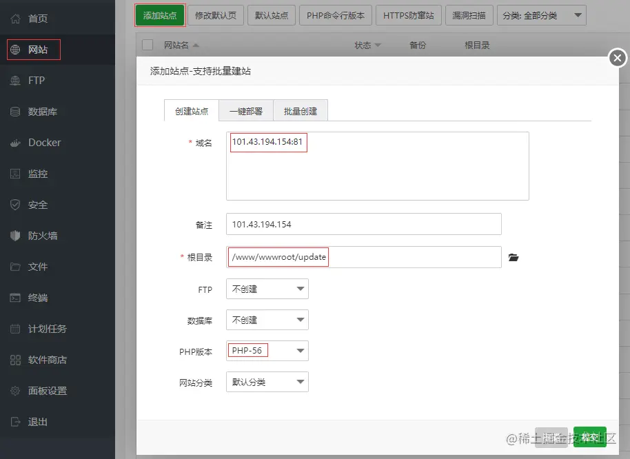 第二个站点域名填写 IP:81,IP 为你的服务器 IP,也可以填写域名,只要与客户端修改的对应即可,根目录指向 \www\wwwroot\update,PHP 版本仍使用 PHP-56。
