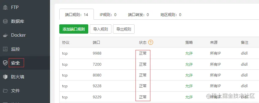 在宝塔安全菜单中单独开放的端口可以查看端口的使用状态,建议大家单独设置。
