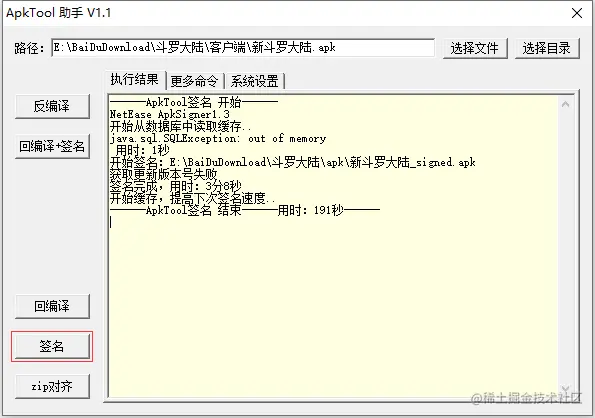 修改完客户端需要进行签名,在资源工具目录下找到 jdk18.exe 安装到本机,安装好 JDK 环境后,使用资源工具目录下的 ApkToolAid,选择文件 新斗罗大陆.apk,点击签名按钮进行签名,提示“获取更新版本号失败”可以无视,后台会继续签名操作,整个签名过程大概 5 分钟。