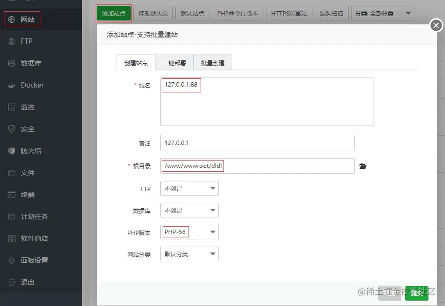 需要创建两个网站,在宝塔网站菜单中添加站点,第一个站点域名填写 127.0.0.1:88,根目录指向 \www\wwwroot\dldl,PHP 版本使用 PHP-56。