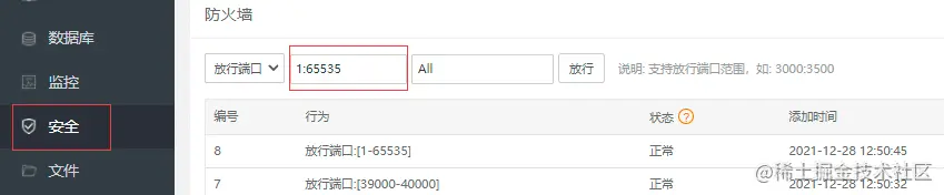 然后在宝塔菜单安全中开放所有端口。
