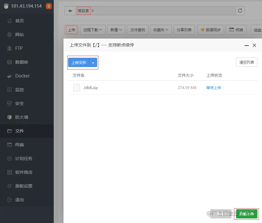 拿到源码后,将服务端目录下的 dldl.zip 压缩文件通过宝塔上传到根目录(如果宝塔禁止上传到根目录,可上传其他路径后剪切粘贴到根目录)。