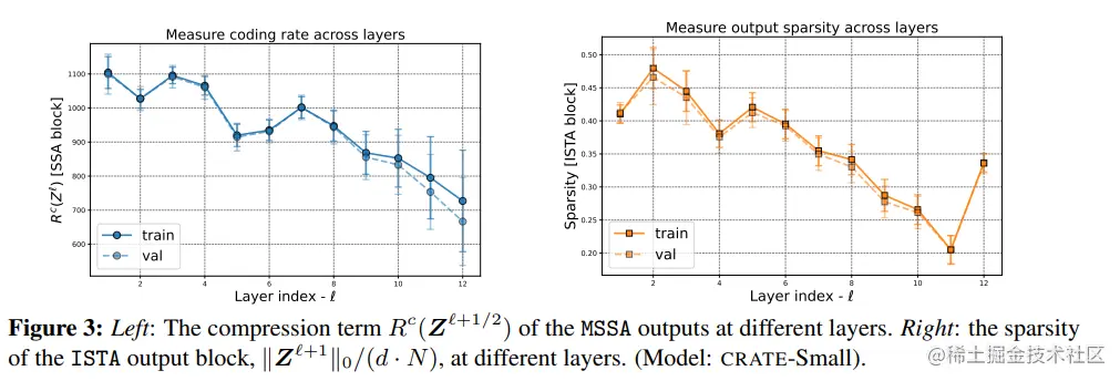 随着层索引的增加,可以看到CRATE-Small模型在大多数情况下的压缩和稀疏化项都得到了提升,最后一层稀疏性度量的增加是由于用于分类的额外线性层。