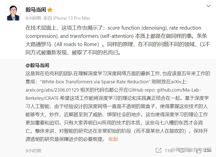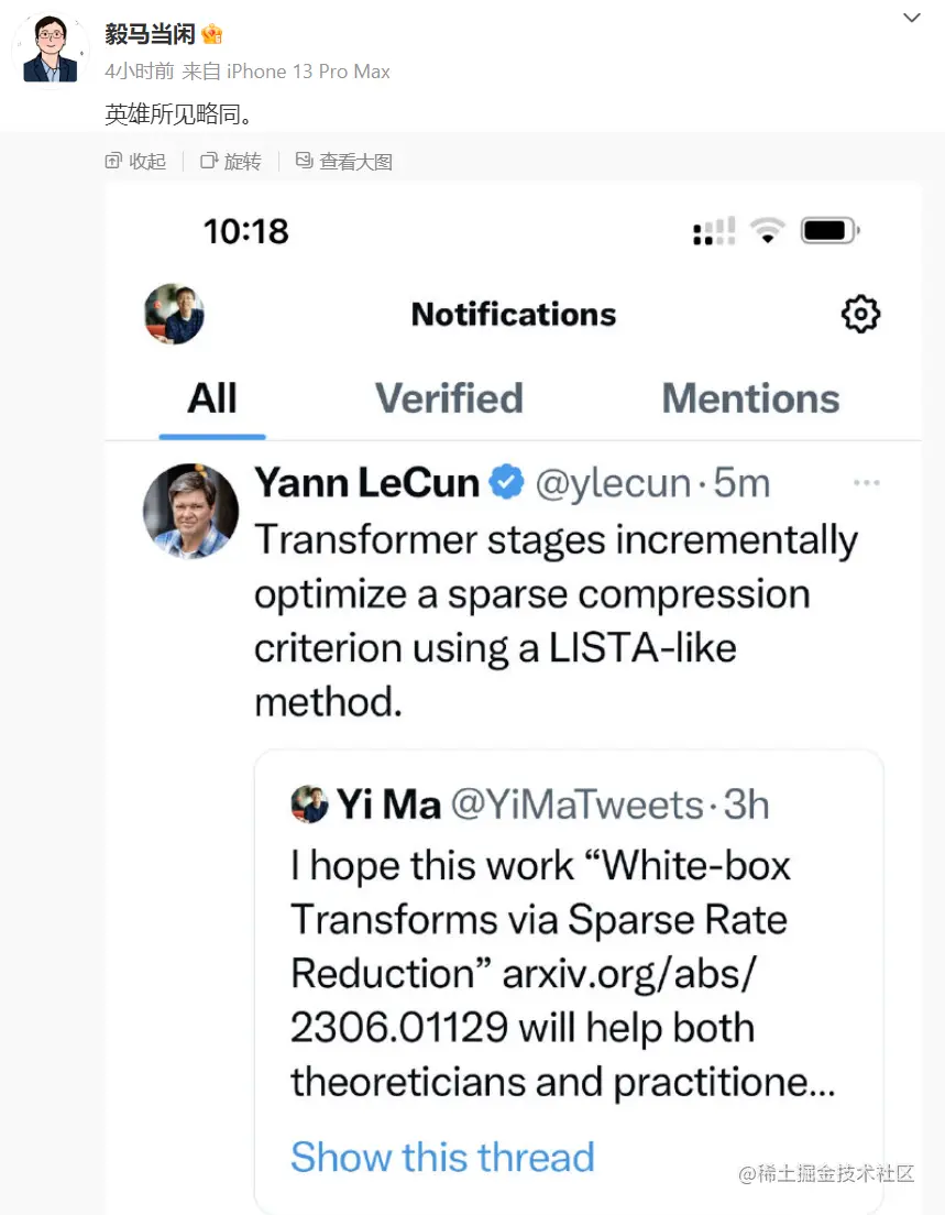 图灵奖得主Yann LeCun对马毅教授的工作也表示赞同,认为Transformer使用LISTA(Learned Iterative Shrinkage and Thresholding Algorithm)类似的方法增量地优化稀疏压缩。