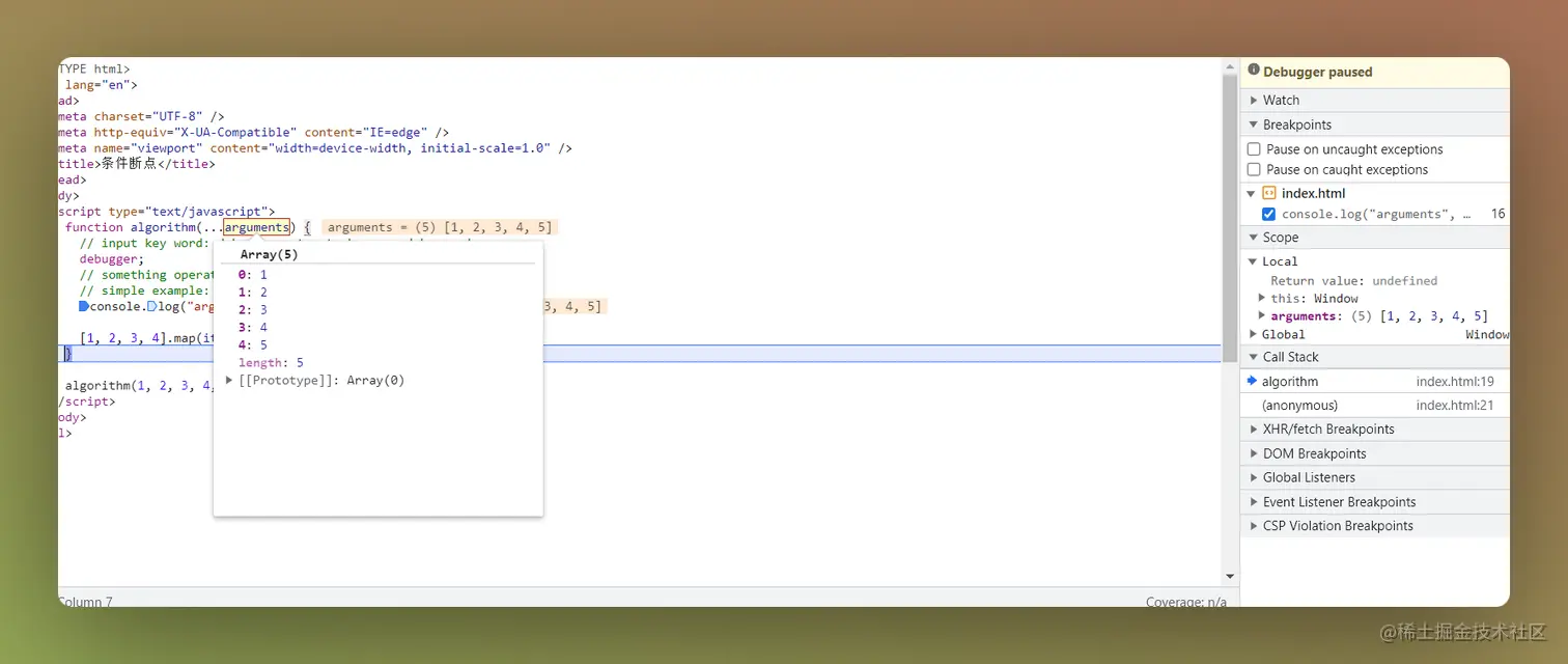 上述简单的介绍了调试的使用,这里讲讲本章的中心内容"条件断点"。笔者也是在近期更频繁的使用debug时偶然发现的一个调试方式,大部分的时间可能大家与我一样更习惯使用console.log进行调试。当然,大部分的场景下使用日志打印的效率不会低于Debug调试。我使用调试的情况是需要与另一个语言的代码进行逐步比对以确保"算法语言移植"的正确性,此时使用日志打印显然是一个巨大的工程。