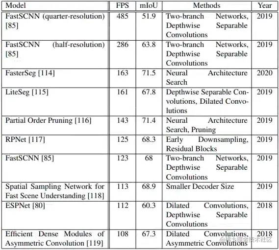 如下表2和表3所示,在CityCapes公开数据集上现有部分语义分割模型进行实验比较,从分割准确性和实时性角度分别排序。