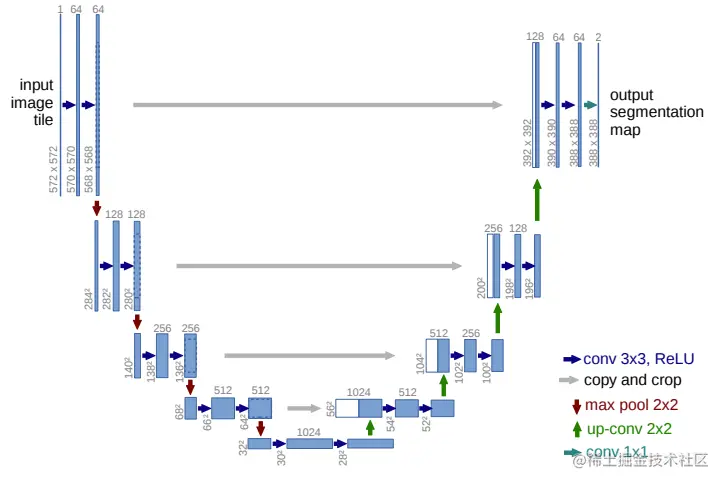 2.更丰富的信息融合:如灰色剪头,更多的前后层之间的信息融合。这里是把前面层的输出和后面层concat(串联)到一起,区别于FCN的逐元素加和。不同Feature map串联到一起后,后面接卷积层,可以让卷积核在channel上自己做出选择。注意的是,在串联之前,需要把前层的feature map crop到和后层一样的大小。