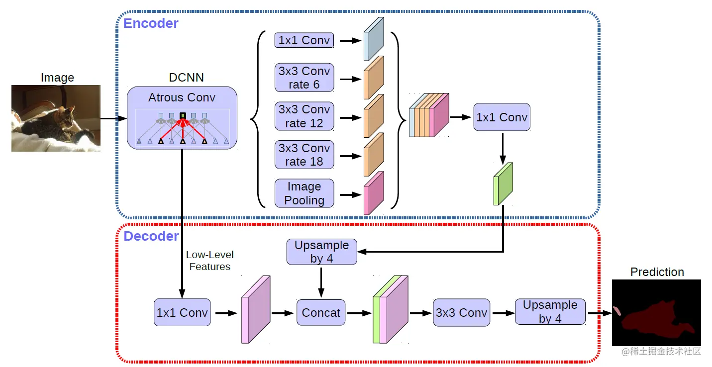 可以看成是把原Deeplab V3当作encoder,添加decoder得到新的模型(Deeplab V3+)。与V3不同的是,这里将空洞卷积和深度分离卷积结合,得到一个atrous separale convolution(也就是把空洞卷积应用在深度分离卷积上),能够在维持相同性能的情况下,深度分离卷积可以大大减小计算复杂度。后面再进行解码,并且在解码的过程中在此运用了不同层级特征的融合。此外,在encoder部分加入了Xception的结构减少了参数量,提高运行速度。