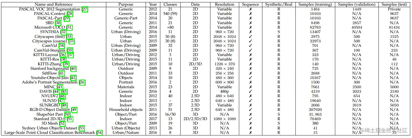 关于分割的开源/闭源数据集数量众多,并且基于很多重大数据集举办了很多竞赛。为了综述的完整性考虑,对现有的经典数据集进行总结。