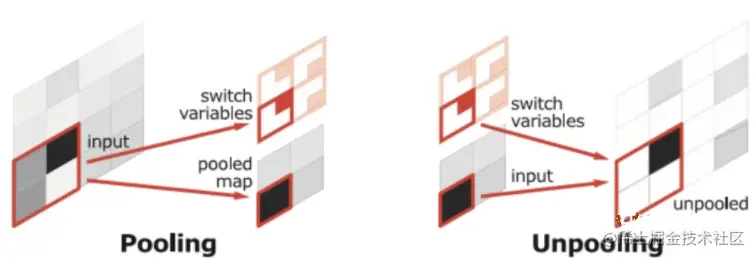 在结构上看,SegNet和U-net其实大同小异,都是编码-解码结果。区别在意,SegNet没有直接融合不同尺度的层的信息,为了解决为止信息丢失的问题,SegNet使用了带有坐标(index)的池化。如图10所示,在Max pooling时,选择最大像素的同时,记录下该像素在Feature map的位置(左图)。在反池化的时候,根据记录的坐标,把最大值复原到原来对应的位置,其他的位置补零(右图)。后面的卷积可以把0的元素给填上。这样一来,就解决了由于多次池化造成的位置信息的丢失。