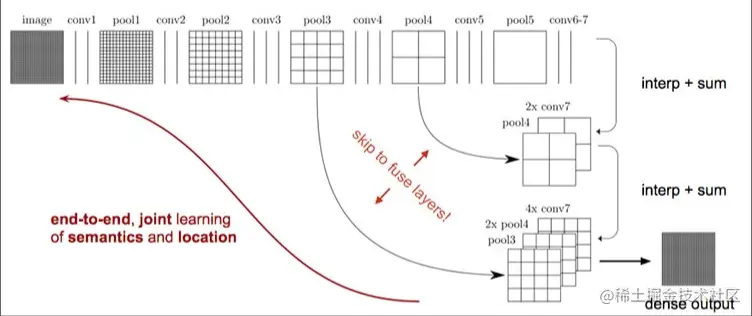 如下图所示,对原图像进行卷积conv1、pool1后原图像缩小为1/2;之后对图像进行第二次conv2、pool2后图像缩小为1/4;接着继续对图像进行第三次卷积操作conv3、pool3缩小为原图像的1/8,此时保留pool3的featureMap;接着继续对图像进行第四次卷积操作conv4、pool4,缩小为原图像的1/16,保留pool4的featureMap;最后对图像进行第五次卷积操作conv5、pool5,缩小为原图像的1/32,然后把原来CNN操作中的全连接变成卷积操作conv6、conv7,图像的FeatureMap数量改变但是图像大小依然为原图的1/32,此时图像不再叫featureMap而是叫HeatMap。之后再进行上采样(反卷积),这个时候就看是需要采用哪个层的特征图了,所以也就会有FCN-32s,FCN-16s,FCN-8s。
