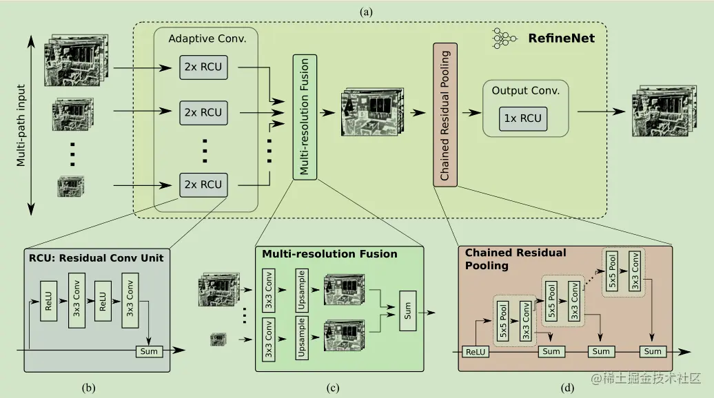 RefineNet可以分为三个主要部分: 1. 不同尺度(也可能只有一个输入尺度)的特征输入首先经过两个Residual模块的处理; 2. 之后是不同尺寸的特征进行融合。当然如果只有一个输入尺度,该模块则可以省去。所有特征上采样至最大的输入尺寸,然后进行加和。上采样之前的卷积模块是为了调整不同特征的数值尺度; 3. 最后是一个链式的pooling模块。其设计本意是使用侧支上一系列的pooling来获取背景信息(通常尺寸较大)。直连通路上的ReLU可以在不显著影响梯度流通的情况下提高后续pooling的性能,同时不让网络的训练对学习率很敏感。最后再经过一个Residual模块即得RefineNet的输出。