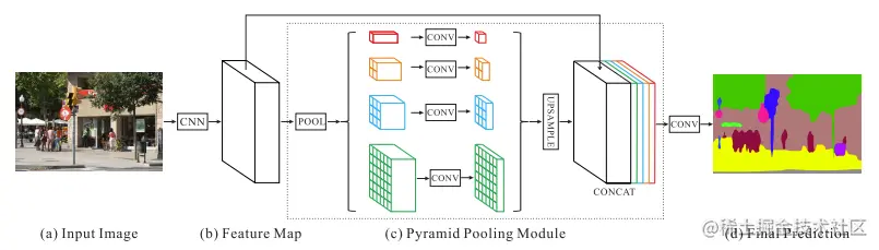 原理都大同小异,前面的不同level的信息融合都是融合浅层和后层的Feature Map,因为后层的感受野大,语义特征强,浅层的感受野小,局部特征明显且位置信息丰富。PSPnet则使用了空间金字塔池化,得到一组感受野大小不同的feature map,将这些感受野不同的map concat到一起,完成多层次的语义特征融合。