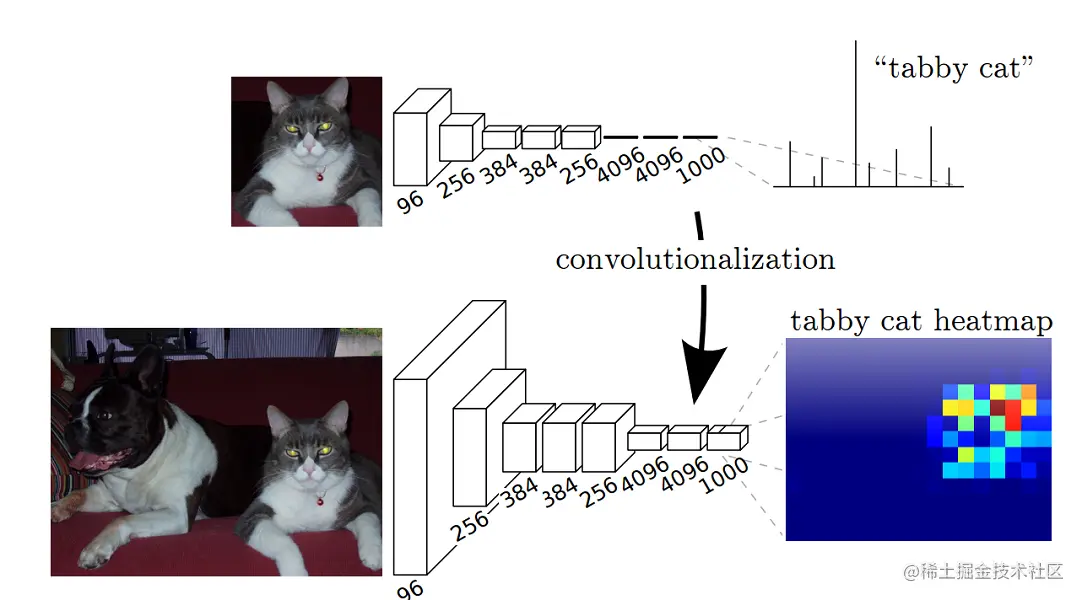 以AlexNet为例,AlexNet原来的结构是224x224大小的图片经过一系列卷积,得到大小为1/32 = 7x7的feature map,经过三层全连接层,得到基于FC的分布式表示。我们把三层全连接层全都换成卷积层,卷积核的大小和个数如图5中间行所示,我们去掉了全连接层,但是得到了另外一种基于不同channel的分布式表示:Heatmap热图。(经过多次卷积和pooling以后,得到的图像越来越小,分辨率越来越低,最终产生的热图就是我们最重要的高维特征图,得到heatmap之后就是最重要的一步也是最后的一步对原图像进行upsampling,把图像进行放大到原图像的大小)