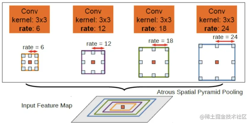 Deeplab v2在v1的基础上做出了改进,引入了空洞空间金字塔池化ASPP(Atrous Spatial Pyramid Pooling)的结构,如上图所示。