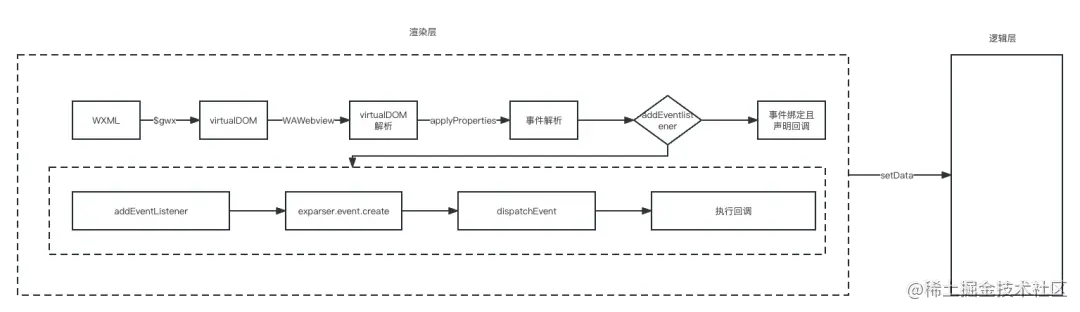 那逻辑层又是如何将改变后的数据回传给渲染层的呢?逻辑层改变数据之后,同样是触发setData方法,然后渲染层通过subscribe进行监听,从eventname和触发事件时候记录的回调函数来判断是哪个事件被触发了,从而获取动态数据。