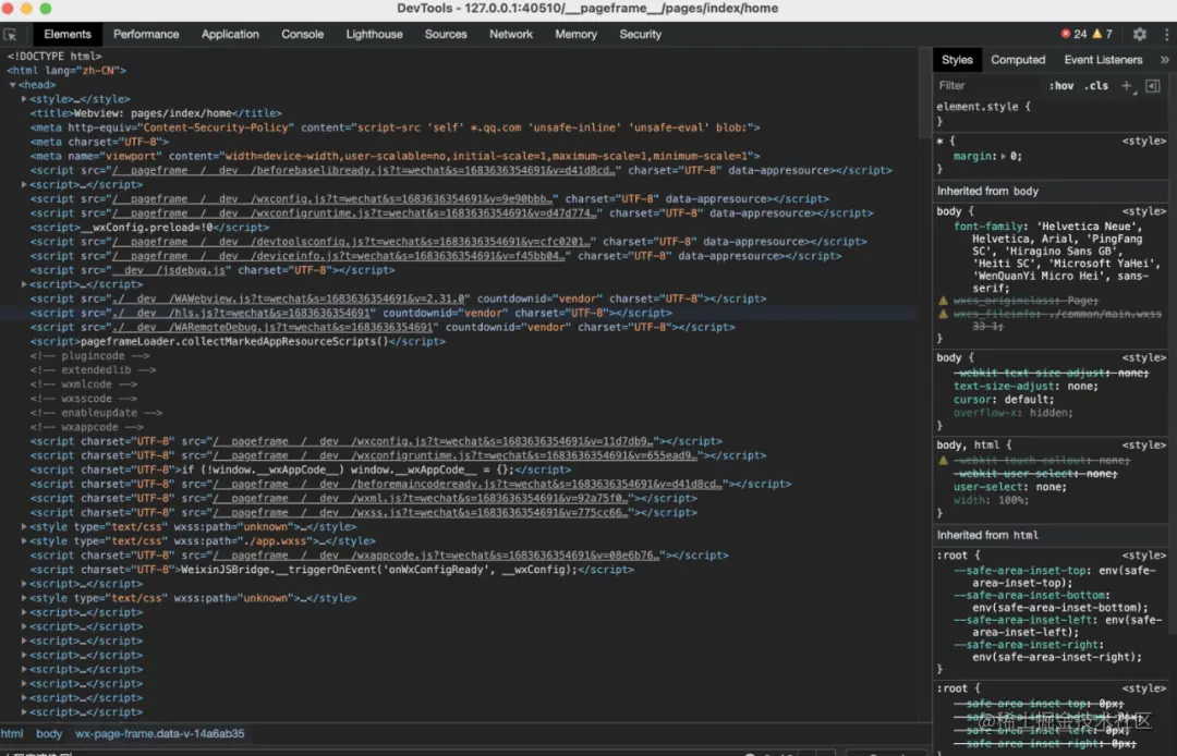 我们在打开pages/index/index视图页面时,发现DOM中多加载了一个__pageframe__/pageframe.html的视图层。这个视图层的作用正是小程序提前为一个新的页面层准备的。小程序每个视图层页面内容都是通过pageframe.html模板来生成的,包括小程序启动的首页。