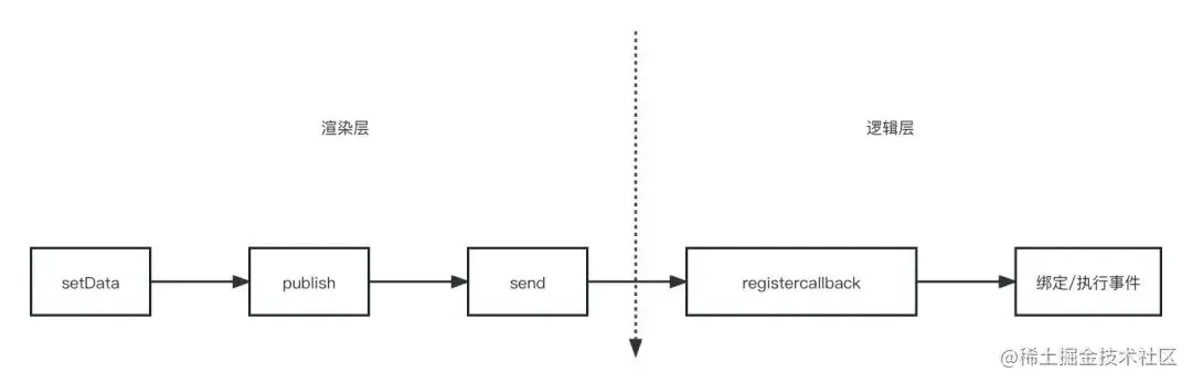 用户点击相应DOM时,Exparser组件系统接收到这个事件,然后开始执行回调。回调函数在逻辑层,事件的触发在渲染层,此时,小程序会通过setData发送数据到逻辑层,这个时候WeixinJSBridge就派上用场了,渲染层调用publish方法发送数据,逻辑层通过registercallback进行监听,并执行相应的回调。此时,渲染层到逻辑层的通信流程结束。